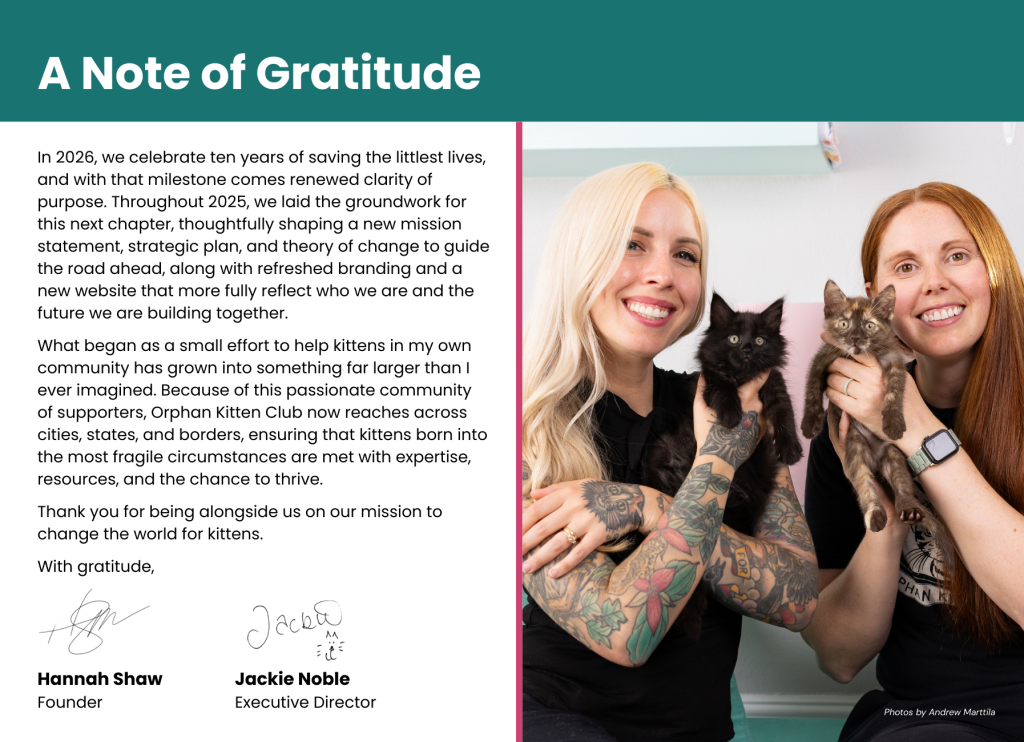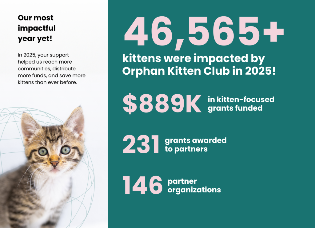 Orphan Kitten Club is changing the world for kittens by equipping shelters across the country with lifesaving resources, collaborating with researchers to advance pediatric veterinary medicine, and expertly caring for high-need neonates in our state-of-the-art kitten nursery.